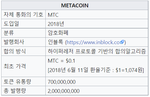 그리고 최초의 하이퍼렛저 퍼블릭의 코인은 한국의 인블록(Inblock)에서 만든 '메타 코인'입니다.