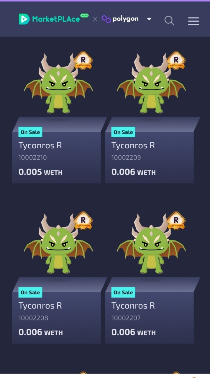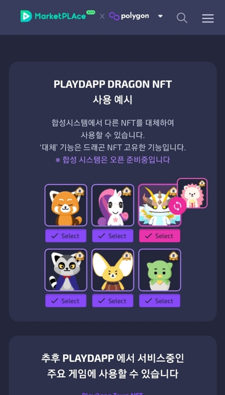 귀... 귀엽습니다. 제 첫 NFT가 된 플레이댑의 캐릭터 드래곤... Tyconros라는 캐릭터 같은데요. 이렇게 모은 캐릭터들을 플레이댑 마켓플레이스에서는 판매하고 있는 사람들도 있습니다.