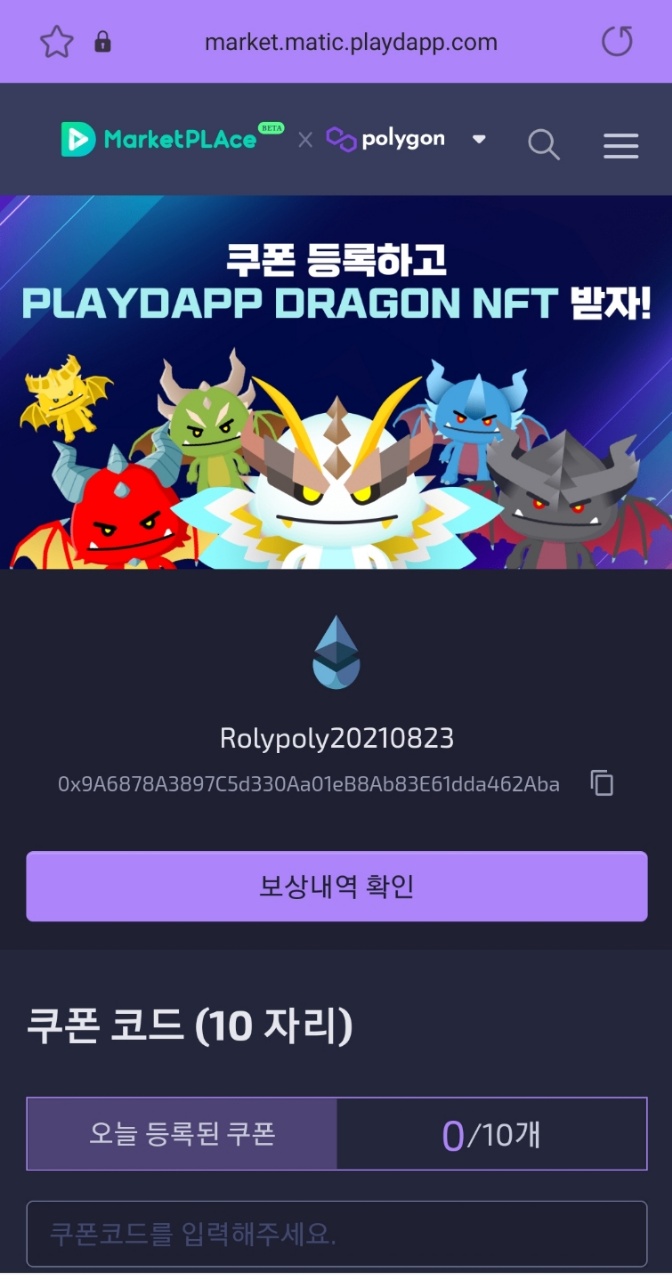 각각 METAMASK, coinbase(크으~), portis가 있는데, 저는 portis와 연동해서 개설했습니다. 이메일과 비밀번호를 등록하고나면 플레이댑 주소가 생성되는데요. 이제부터 본격적으로 쿠폰을 등록할 수 있습니다.