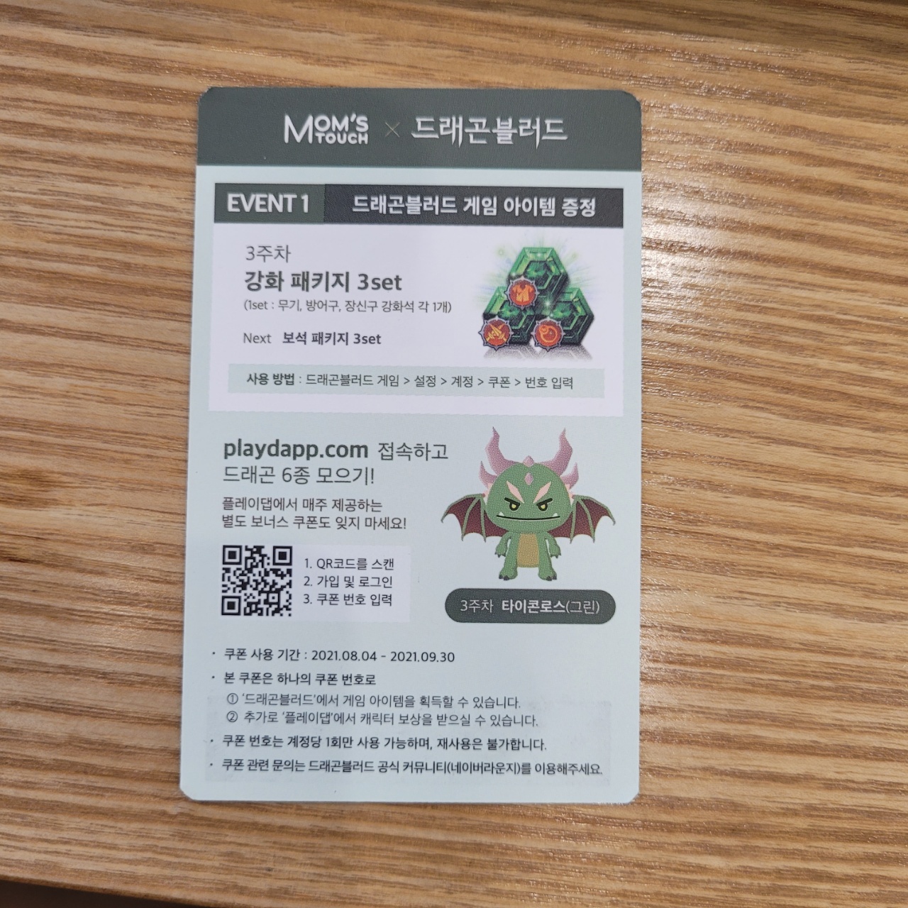 주문하면 제품과 함께 이렇게 생긴 쿠폰을 줍니다. 동전으로 시원하게 긁어주면 코드가 나오는데요. 이 코드는 쿠폰 뒷면에 있는 qr코드를 통해 플레이댑 마켓플레이스에 들어가면 등록할 수 있습니다(참고로 드래곤블러드 내에서는 캐릭터를 주지 않고 강화석과 같은 아이템이 지급됩니다).